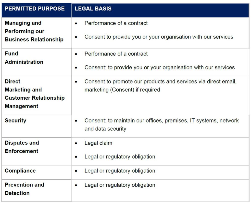 - Fund Administration: If you or your organization are an investor in a fund managed or owned by us, to administer and manage such investment, including holding your information on the ownership register, using your contact details to send you notices of meetings and investor communications and using your financial information (e.g. bank account details) to make payment of redemption or distribution monies.